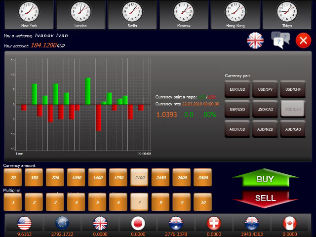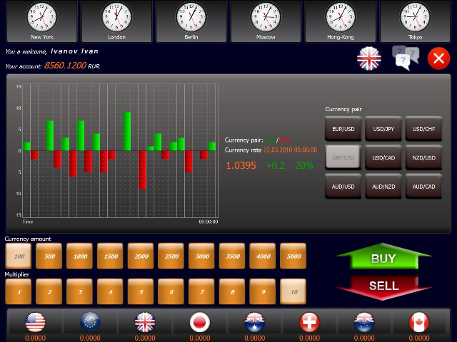 The machine monitor displays the chosen parameters and the current datafeed for the chosen currency pair. Transaction resulting from the alteration in rates. Then in accordance with his/her expectations and by means of the machine touch keyboard buttons the customer effects a transaction for purchase/sale of the chosen instrument (currency pair) and thus starts the trade cycle. Trade session results, touch kiosk interface. The Exchange Complex calculates cash balance for each new quotation and displays it on the screen.